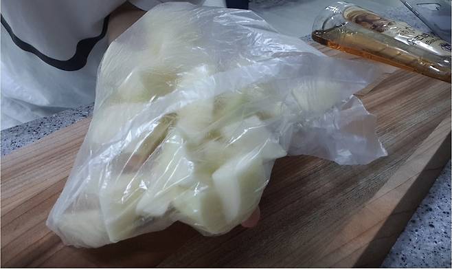 물기를 제거한 감자는 위생백에 담아 식용유를 몇 방울 떨어뜨려주세요