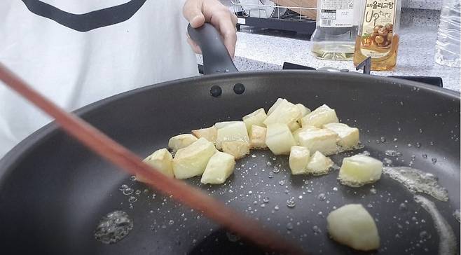 너무 크면 잘 안 익을 수 있으니 한입크기로 적당한 크기로 깍둑 썰어줍니다