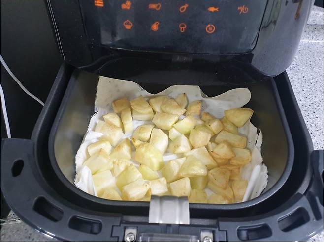 기름칠한 감자를 최대한 겹치지 않게 에어프라이어에 넣어주세요