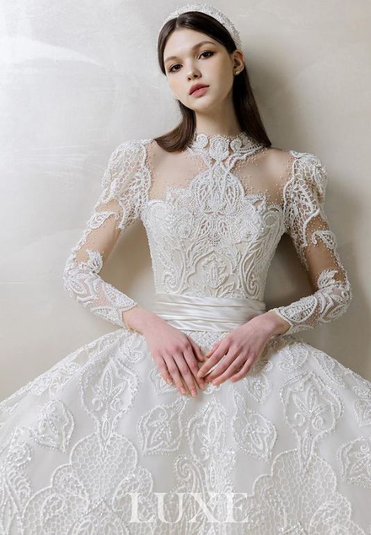 김보경은 헤어를 늘어뜨리고 티아라를 착용해 고급스러운 느낌을 주었고, 긴 면사포를 더해 몽환적인 분위기를 자아냈다.