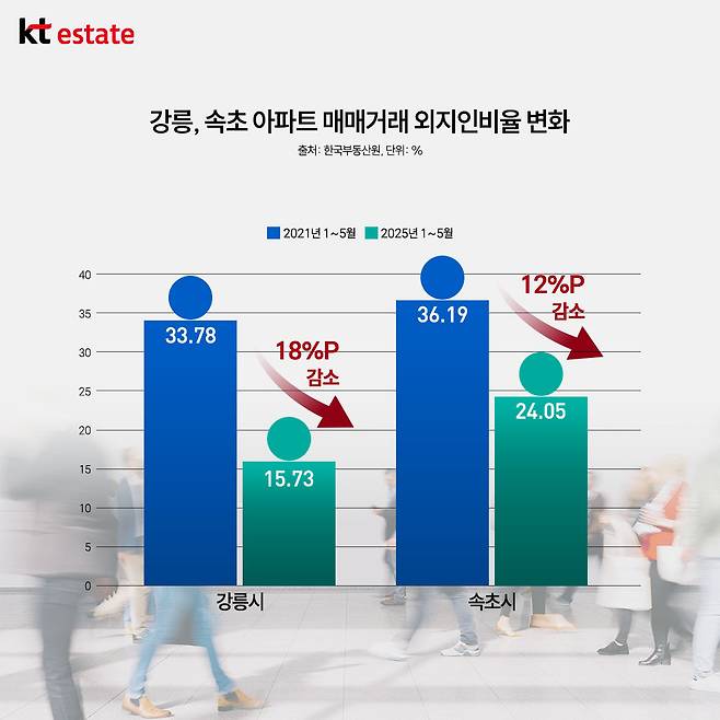 2025년 5월까지 속초의 외지인 거래비율은 24.05%로 2021년 동기간과 비교하면 12%P 가량 감소했고 강릉도 외지인 거래비율이 2021년 5월까지 33.78%에서 2025년 5월까지 15.73%로 내려갔습니다.