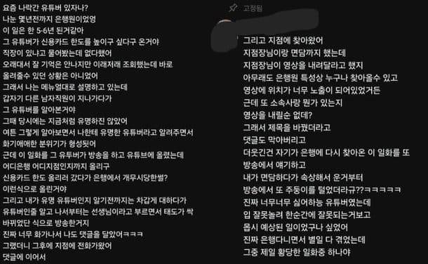 해당 은행원이라고 밝힌 글쓴이 A 씨는 "유튜버가 신용카드 한도를 높이고 싶다고 왔다. 직장이 있냐고 물어봤는데 없다더라. 오래돼서 잘 기억은 안 나지만 이것저것 조회했는데 바로 (한도를) 올려줄 수 있던 상황은 아니었다. 그래서 나는 매뉴얼대로 설명하고 있는데 갑자기 다른 남자 직원이 지나가다가 그 유튜버를 알아봤다. 그때 당시에는 지금처럼 유명하진 않았다"라고 설명을 시작했습니다.