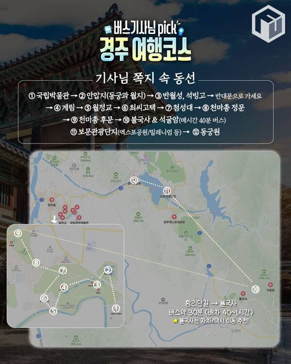 버스기사님의 코스는 아주 알차지만 하루에 다 돌기엔 다소 무리가 있습니다. 이에 여행톡톡이 버스기사님의 경주여행코스를 활용하는 꿀팁을 알려드리려고 하는데요.