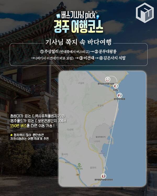 버스기사님의 코스는 아주 알차지만 하루에 다 돌기엔 다소 무리가 있습니다. 이에 여행톡톡이 버스기사님의 경주여행코스를 활용하는 꿀팁을 알려드리려고 하는데요.