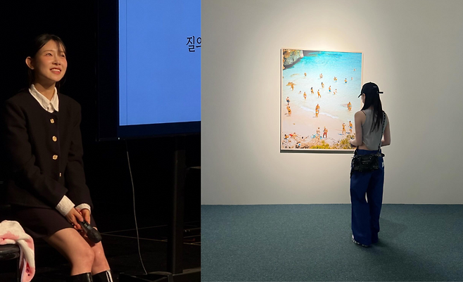 마지막 사진에서는 그레이 톤의 민소매 톱과 네이비 와이드 팬츠를 매치한 미니멀한 캐주얼 룩을 선보이고 있다. 블랙 캡으로 포인트를 주며 갤러리를 관람하는 모습으로 지적이고 세련된 일상 스타일을 완성하고 있다.