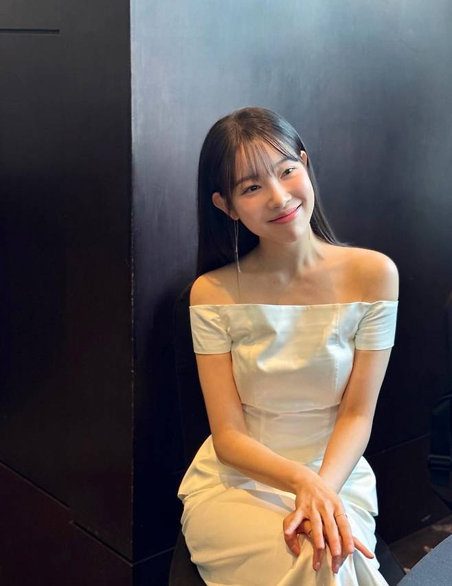 첫 번째 사진에서 김아영은 연한 베이지 톤의 오프숄더 원피스를 착용하며 단아한 매력을 선보이고 있다. 어깨선을 드러내는 오프숄더 디자인과 타이트한 실루엣이 그녀의 우아한 체형을 돋보이게 하고 있으며, 긴 생머리와 함께 클래식한 아름다움을 연출하고 있다.