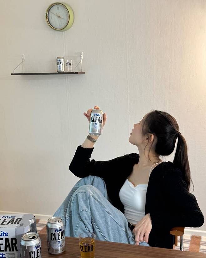 두 번째 사진에서는 검은색 니트 가디건과 화이트 탱크톱, 연청 데님 팬츠를 매치한 편안한 룩을 선보이고 있다. 특히 맥주 캔을 들고 있는 자연스러운 모습으로 일상적이면서도 세련된 홈웨어 스타일을 완성하고 있다.