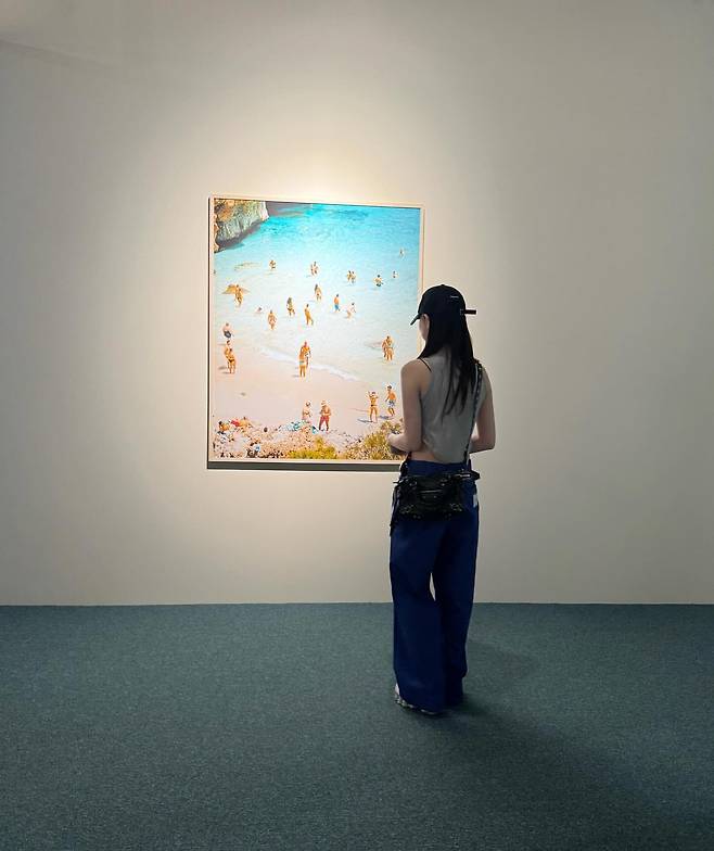 마지막 사진에서는 그레이 톤의 민소매 톱과 네이비 와이드 팬츠를 매치한 미니멀한 캐주얼 룩을 선보이고 있다. 블랙 캡으로 포인트를 주며 갤러리를 관람하는 모습으로 지적이고 세련된 일상 스타일을 완성하고 있다.