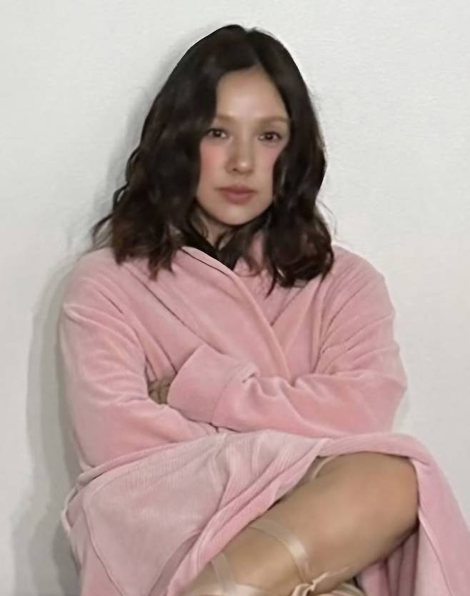 이효리는 포근한 분홍색 로브를 걸친 채 블랙 쇼파 위에 앉아 카메라를 응시하는 모습을 공개했습니다.