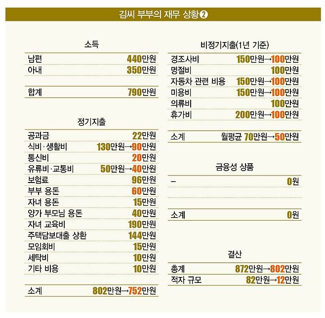 지출로는 정기지출 858만원, 1년에 걸쳐 쓰는 비정기지출 월평균 70만원 등 928만원이다. 한달에 적자가 138만원씩 발생하는 셈이다. 저축 같은 금융성 상품은 없다. 부부는 1차 상담에서 통신비와 용돈 등 총 56만원을 절약해 적자 규모를 82만원으로 줄였다. 현재 부부는 자가 아파트(시세 4억원)에 살고 있고, 갚아야 할 주택담보대출금이 1억원가량 남은 상태다.