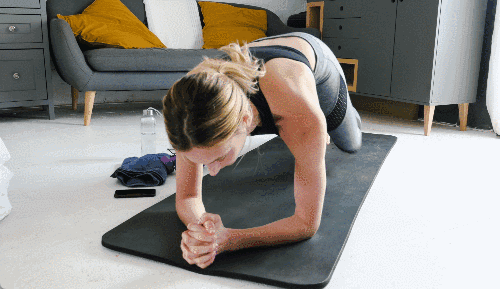 팔꿈치 플랭크 자세를 취합니다. 복부에 힘을 주며 몸을 곧게 유지한 상태에서 오른쪽 팔꿈치를 먼저 펴 손바닥을 바닥에 댑니다. 이어서 왼쪽 팔꿈치도 펴 양손이 바닥에 닿은 플랭크 기본자세를 만든 뒤, 다시 팔꿈치를 하나씩 굽혀 원래의 팔꿈치 플랭크 자세로 돌아옵니다.