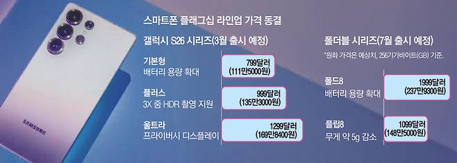 삼성전자가 올해 3월 출시하는 스마트폰 플래그십 모델 '갤럭시 S26' 시리즈의 가격을 동결하기로 했다.