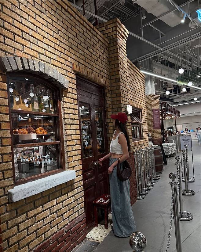 그녀가 서 있는 장소는 베이커리 숍 앞. 유리창 너머로 보이는 따뜻한 조명과 갓 구운 빵이 분위기를 더욱 로맨틱하게 만들며, 시은미의 캐주얼하면서도 감각적인 스타일이 더욱 돋보인다. 배경과 룩, 그리고 인물의 조화가 완벽하게 어우러지며, 마치 화보 한 장면을 연상케 한다.