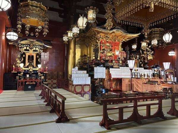 입구에서 보니 본당 중앙에 불상이 모셔져 있는데, 큰 불상을 모시는 우리나라와 달리 크기가 상당히 작다. 본당의 천정에는 그림이 그려져 있는데, 이 그림이 센소지 본당 내부의 특징 중 하나란다.