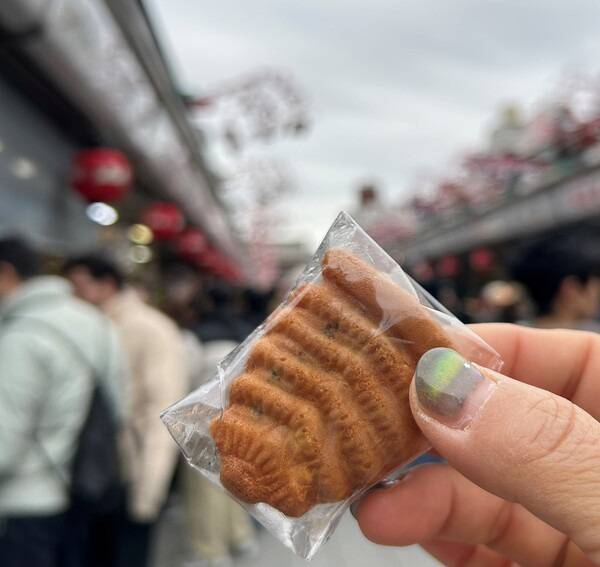 입구의 몇 개 상점을 지나자 닝교야끼(ningyo yaki)를 파는 가게가 있다. 닝교야끼는 팥소가 들어간 작은 빵이라는데, 제주도 시장에서 볼 수 있는 하르방빵과 모양만 다를 뿐 비슷한 느낌이다. 센소지절로 향하는 거리여서인지, 걸으면서 음식을 먹으면 안 된다고 한다.