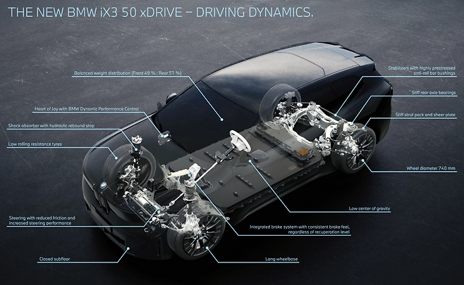 BMW iX3 50 xDrive는 듀얼 모터 기반 AWD로 최고출력 463마력, 최대토크 65.8kg.m을 발휘하며 제로백 가속은 단 4.7초에 불과합니다. 여기에 최고속도는 209km/h로 제한되며, 주행의 즐거움을 위해 스포츠, 이피션트, 사일런트, 퍼스널 등 총 4가지 드라이빙 모드를 제공을 통해 운전자 성향에 맞는 다양한 주행감을 경험할 수 있습니다.