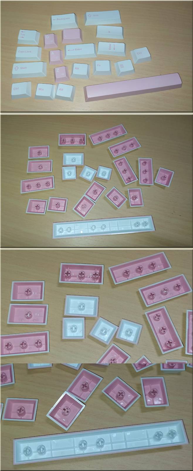 키캡 일부를 분리해보았는데, 스테빌라이저 쪽은 체리식 스테빌라이저가 적용되어 있습니다. 스테빌라이저가 적용된 쪽은 키캡 분리시 키스위치도 같이 딸려 나오는 경향이 있네요.
