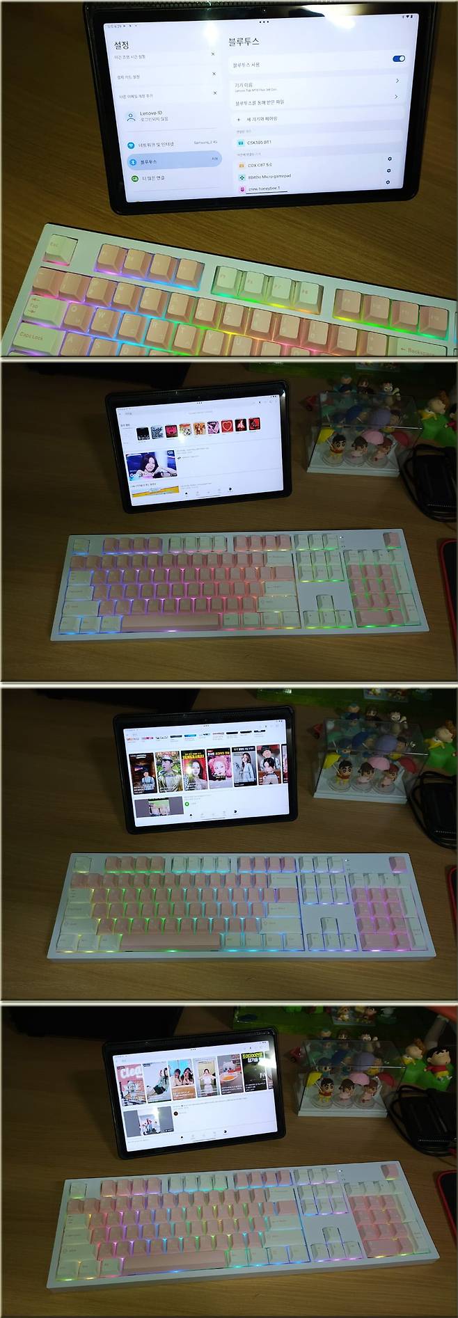 접이식 블루투스 키보드의 경우 휴대하기는 편리하지만 타건하기는 불편한 편인데 실내에서 태블릿 사용시 콕스 CSK105 기계식 키보드와 같은 키보드를 사용하면 더욱 편리하게 글자를 입력할 수 있겠습니다.