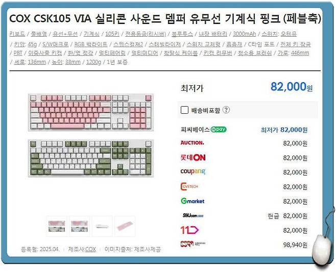 이번에 소개할 제품은 COX CSK105 VIA 실리콘 사운드 뎀퍼 유무선 기계식 핑크 (페블축)으로 현재 오픈마켓 쇼핑몰 최저가로는 82,000원이라는 가격대로 판매가격이 나와 있습니다.