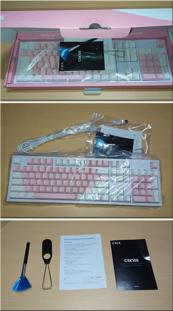 제품 박스를 개봉해보니 사용설명서와 AS 신청서, 키보드, 브러쉬, 키캡 리무버, 연결 케이블로 패키지가 구성되어 있네요.