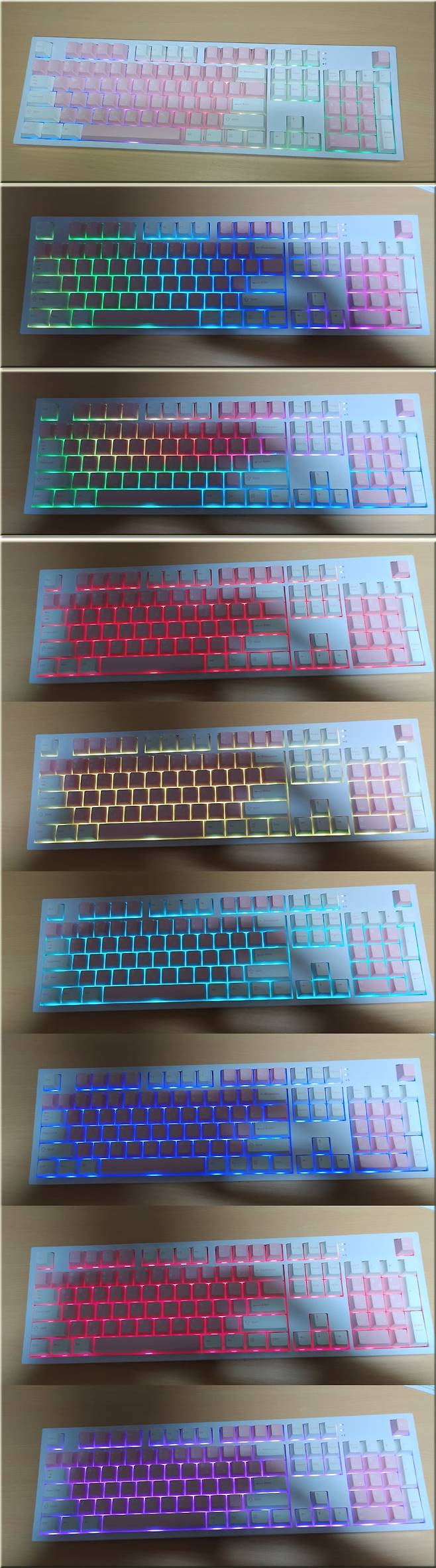 콕스 CSK105는 상당히 다채로운 RGB LED 모드를 제공하는데 백라이트 모드 변경은 FN + INS, 백라이트 온오프는 FN + DEL 입니다. LED 모드 변경은 아래 동영상으로 촬영하여 보았습니다.