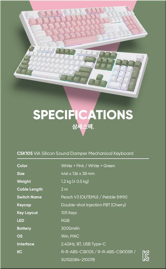 COX CSK105 VIA 실리콘 사운드 뎀퍼 유무선 기계식 핑크 (페블축) 키보드의 사이즈는 446 x 136 x 38 mm 에 무게는 1.2kg 정도로 105키 풀배열 타입으로 페블축 스위치가 적용되어 상당히 부드러우면서도 무게감 있는 쫀득한 타건감을 선사해주고, 유무선과 블루투스를 지원하며, 윈도우 뿐만 아니라 맥OS도 지원하여 활용도가 다양하겠습니다.