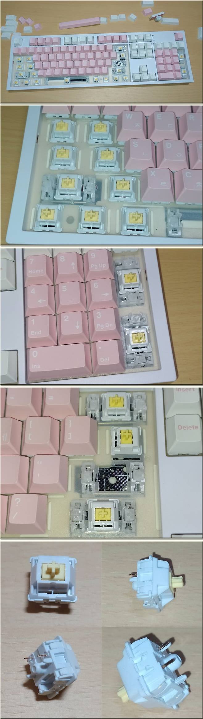 페블축은 (페블은 조약돌이란 뜻인데 제품 DB페이지 상에 나와 있는 조약돌 소리?는 솔직히 잘 모르겠네요) 저소음 피치축 보다 페블축이 +5gf 정도 키압이 더 높은 관계로 부드러우면서도 딥하고 좀더 묵직한 타건감이 특징인 스위치입니다.