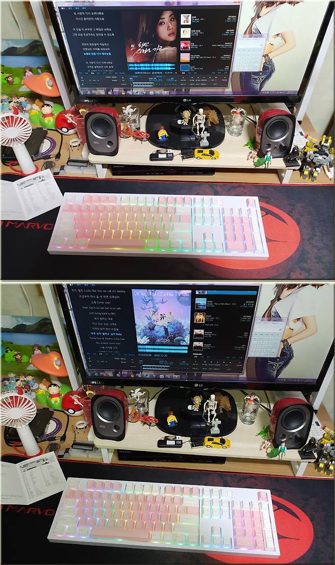 멀티미디어 기능키도 제공하는데 FN + F1~F12의 조합으로 사용할 수 있습니다. 다만 ABS 키캡이었을 경우엔 F1~F12키에 무슨 기능키인지 설명이 인쇄되어 보기 쉽고 사용하기 편했었는데 PBT 재질의 키캡이다 보니 키에 기능키 설명은 들어 있지 않아서 충분히 익숙해질 때까지는 설명서를 참고하여 사용하는게 좋을 듯 하네요. FN+F5(이전 곡), FN+F7(재생/일시정지), FN+F6(다음 곡) 등 각종 기능키를 제공하여 뮤직플레이어 컨트롤하기도 편리하였습니다.