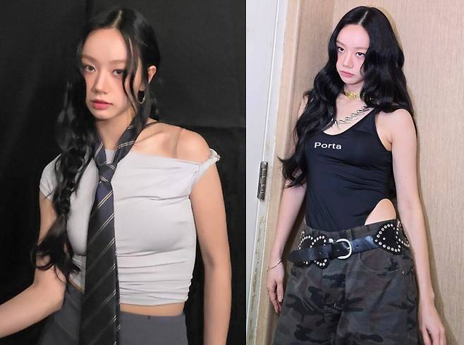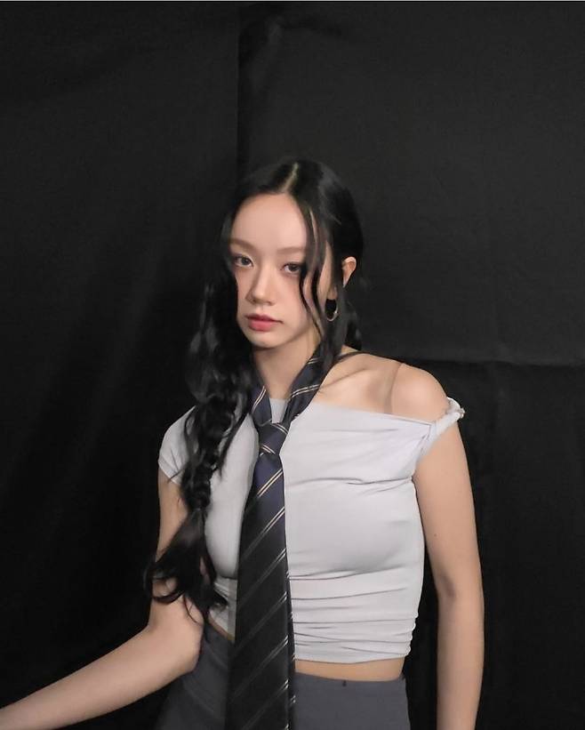 혜리는 오프숄더 느낌의 언밸런스 크롭 톱에 스트라이프 넥타이를 매치해 스쿨룩 무드를 힙하게 재해석했습니다.