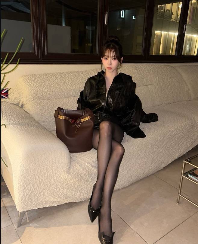 광택이 도는 블랙 가죽 재킷과 쇼츠, 시스루 스타킹의 조합이 늘씬한 각선미를 더욱 강조했습니다.