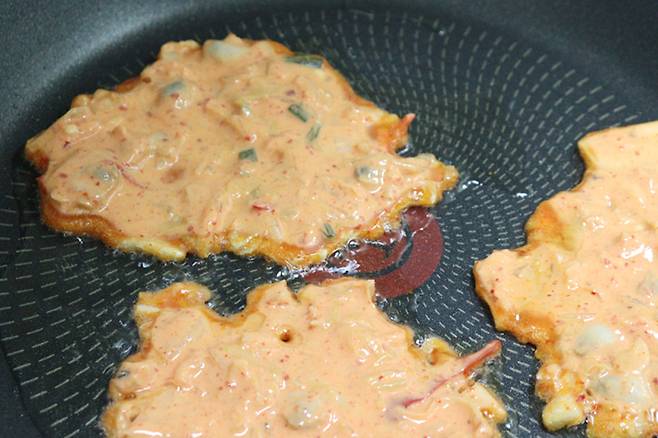 달궈진 팬에 기름을 두르고, 기름의 온도가 올라가면 반죽물을 적당히 떠 넣습니다.