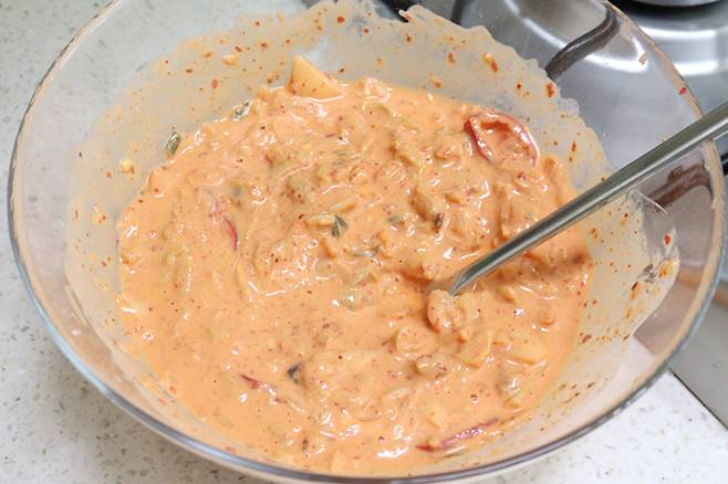 반죽이 너무 묽으면 부침가루를, 너무 되면 물을 추가해 농도를 조절합니다.