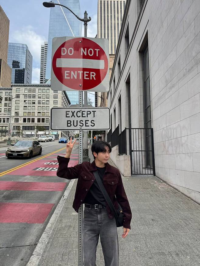 공개된 사진 속 부승관은 시애틀 도심의 거리와 버스 전용차선 표지판 앞에서 손 인사를 건네며 밝은 미소를 짓고 있다. 또 도심의 광장과 포스터 앞에서 자연스러운 포즈를 취하며 여행의 즐거움을 만끽하는 모습이 담겼다. 와인 컬러 재킷과 그레이 데님, 크로스백으로 완성한 가을 패션은 세련된 분위기를 자아냈다.