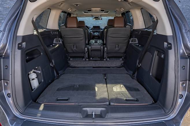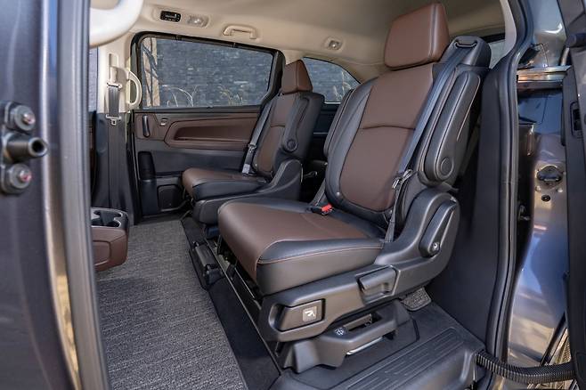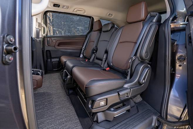 하이라이트는 2열. 오딧세이의 시트 배치 자유도가 경쟁자들에 비해 압도적이다. 양쪽 시트는 앞뒤 슬라이딩과 등받이 리클라이닝, 좌우 이동까지 가능하다. 또한 2열의 모든 시트는 완전히 떼어낼 수도 있다. 3열 시트까지 접어두면 사실상 2인승 화물 밴으로 쓸 수 있는 셈. 부피 큰 짐을 자주 나르는 북미 라이프스타일에 맞춘 설계다. 의외로 3열 시트 착좌감도 포근하다. 바닥 쿠션 길이와 등받이 각도, 가죽 소재까지 기대 이상이다.