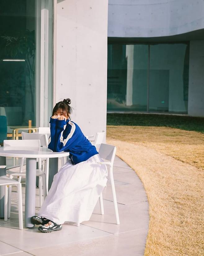 두 번째 룩에서는 푸른색 트레이닝 상의에 여유로운 실루엣의 화이트 롱스커트를 매치해, 상·하의의 질감과 분위기가 뚜렷이 대조를 이룬다. 블루와 화이트의 조화가 깔끔하면서도 경쾌하며, 발끝에는 블랙 포인트의 샌들형 스니커즈가 더해져 이색적인 조화를 완성한다. 재킷 소매 끝을 얼굴까지 올린 귀여운 포즈는 보는 이로 하여금 자연스레 미소 짓게 만든다.
