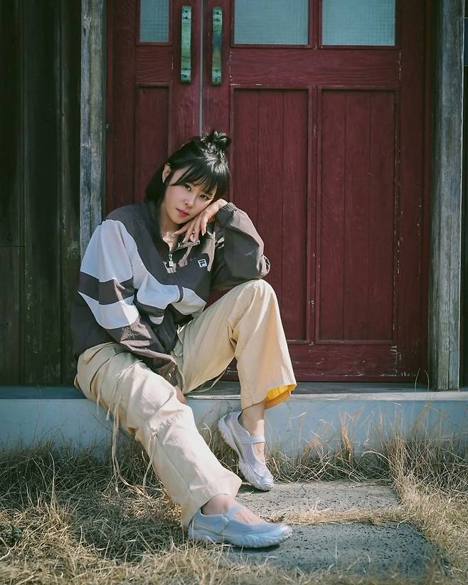 첫 번째 사진에서 최강희는 와인색 목재 문 앞에 앉아, 살짝 고개를 기댄 채 카메라를 응시하고 있다. 그녀는 네이비·화이트·그레이 스트라이프가 혼합된 바람막이 재킷에 베이지 컬러 와이드 팬츠를 매치했다. 발끝에는 캐주얼한 메리제인 무드의 실버 스니커즈를 더해 활동성과 스타일을 모두 챙겼다. 자연스러운 반묶음 헤어와 잔잔한 표정은 룩에 소박한 감성을 더한다.