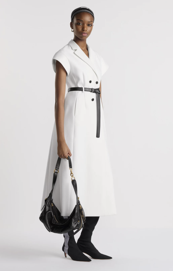 우아한 디올의 정체성을 모던하게 재해석한 이 드레스는 에크루 컬러 특유의 절제된 분위기와 고급 실크·울 혼방 소재의 매끄러운 질감이 인상적이다.