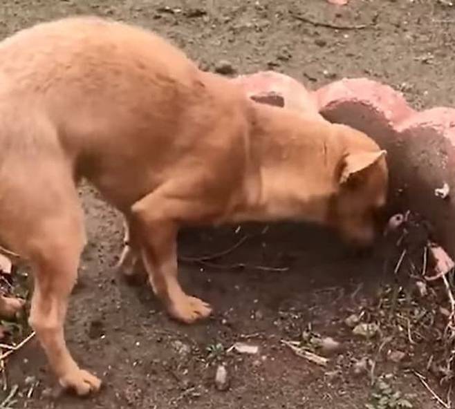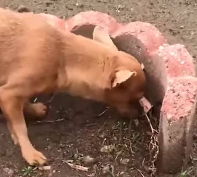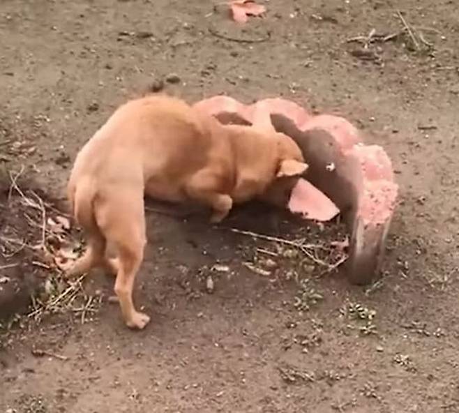 잠시후 이대로 있으면 안되겠다 싶었는지 형아 강아지는 죽은 동생의 무덤을 찾아갔습니다. 그리고 이것을 땅에 묻었죠.