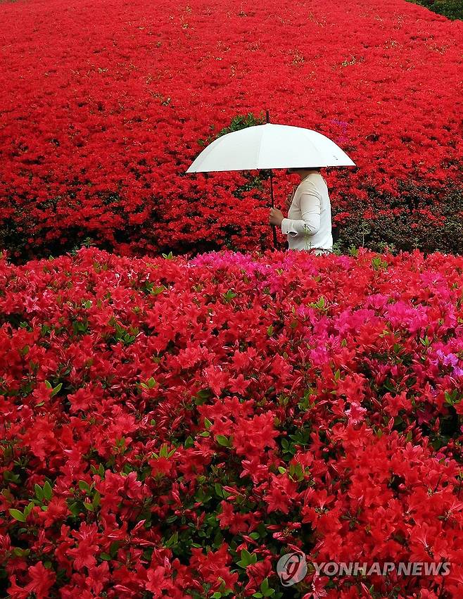 (수원=연합뉴스) 홍기원 기자 = 봄비가 내린 22일 경기도 수원시 팔달구 수월월드컵경기장 인근에서 우산을 쓴 시민이 활짝 핀 철쭉 사이를 지나고 있다. 2025.4.22