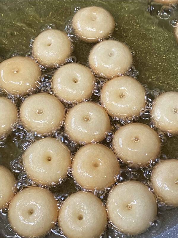 ‘개성주악’이라는 말은 다른 한과류에 비해 이름이 좀 독특한 편이죠? 여기서 ‘주악’은 반죽한 것을 튀길 때 나는 소리에서 붙여진 이름입니다. 마지막 튀김 시 주악들이 서로 부딪히면서 돌멩이 구르는 소리가 난다고 하여 ‘개성주악’으로 전해져 내려오고 있습니다.