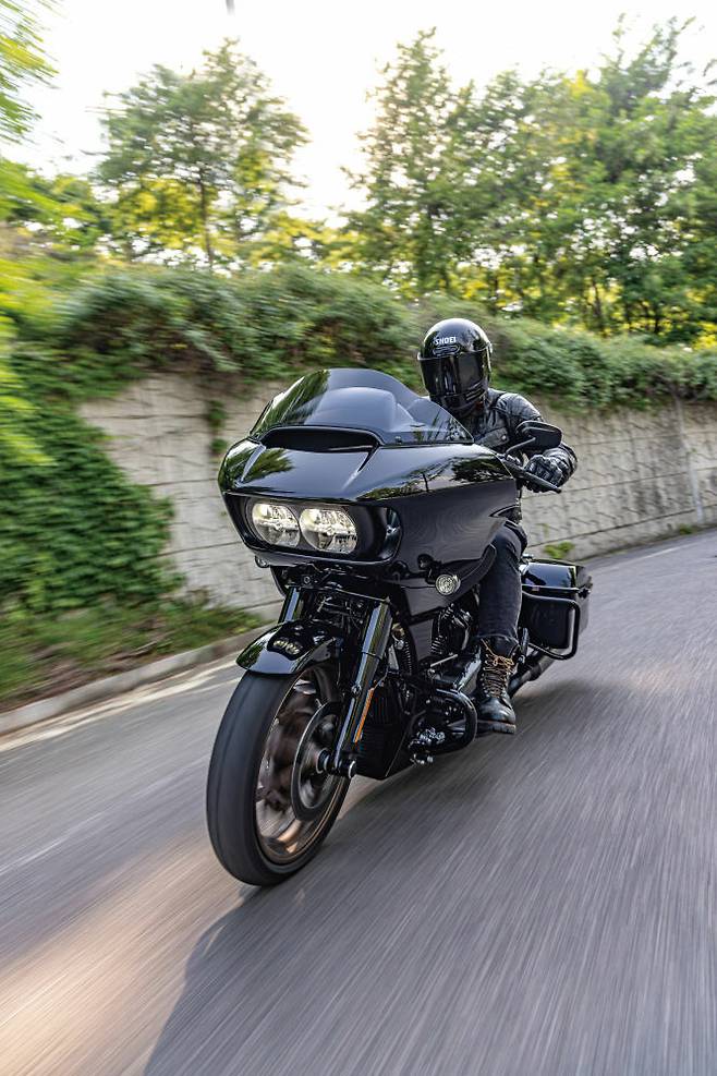 로드글라이드 ST를 타보니 KOTB머신이 어떻게 그렇게 빠른지 이해가 되었다. 차체가 무거우면 그보다 더 강력해지면 될 일, 이런 지극히 미국적인 논리로 빨라진 것이다. 하지만 그로인해 만들어지는 운동에너지는 경량 스포츠와는 비교할 수 없을 만큼 폭발적이다. 일단 엔진부터 스포츠 주행을 자극하고 있다. 지금까지 경험한 할리데이비슨의 엔진은 회전수를 높이면 토크가 슥하고 빠지는 느낌이 들었다. 하지만 117은 고회전까지 지침 없이 가속감이 시원시원하다. 또한 로드글라이드의 장기라고 하면 역시 경쾌한 핸들링을 꼽을 수 있다. 덩치는 산만하지만 발놀림은 그 덩치를 잊게 할 만큼 민첩하다. 코너 초입부터 머뭇거림 없이 방향을 바꾸고 그대로 따라간다. 만약 하이그립타이어를 끼우고 뱅킹각도만 더 확보하기 위해 차고를 높인다면 스포츠바이크못지않게 달리는 것이 결코 이상한 일이 아닐 것이다.