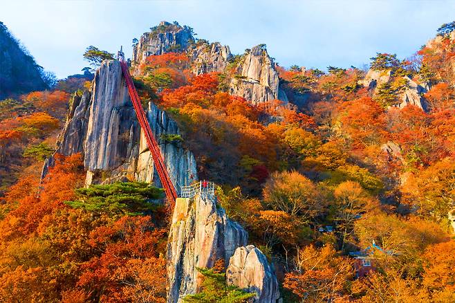 특히 금강구름다리와 삼선계단은 대둔산의 상징적인 명소로, 단풍이 절정일 때는 다리 위에서 붉게 물든 산을 감상할 수 있습니다.