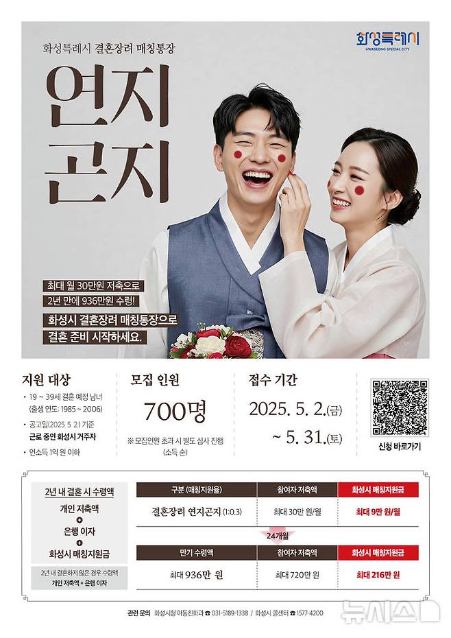 화성시는 2025년 5월부터 결혼예정 청년들을 대상으로최대 936만 원까지 지원받을 수 있는 ‘연지곤지 통장’ 제도를 운영 중입니다.