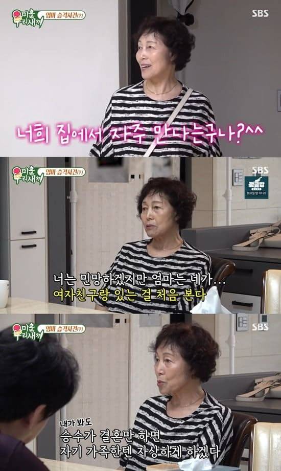 파티 도중, 김승수의 모친이 아들의 생일을 축하하기 위해 깜짝 방문했습니다. 모친은 양정아를 향해 "어떻게 이렇게 예쁜 사람이 친구냐"라며 칭찬을 아끼지 않았고, 양정아 역시 "너무 젊어 보이신다"라고 화답하며 훈훈한 분위기를 연출했습니다. 이어 모친은 "양정아가 너무 예뻐서 너희가 결혼해서 아이를 낳으면 기가 막힐 거야"라며 두 사람의 관계를 적극적으로 응원해 김승수를 당황하게 만들었습니다.
