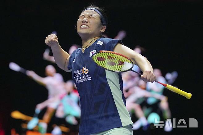 [자카르타=AP/뉴시스] 안세영이 7일(현지시간) 인도네시아 자카르타 이스토라 스타디움에서 열린 세계배드민턴연맹(BWF) 월드투어 슈퍼 1000 인도네시아오픈 여자 단식 준결승 일본 야마구치 아카네와의 경기에서 승리 후 기뻐하고 있다. 2025.06.07.