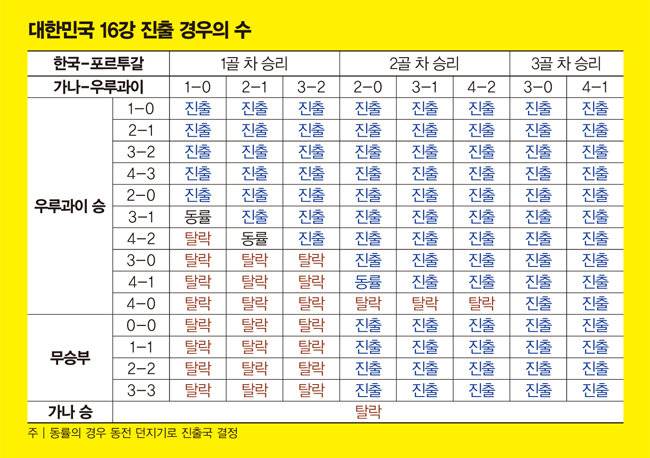 또다시 경우의 수가 펼쳐졌다. 한국 축구 국가대표팀이 11월 28일 가나에 2-3으로 석패하면서 16강 진출을 위한 셈법이 복잡해졌다(표 참조). 포르투갈이 우루과이와 가나를 연이어 꺾어 H조 1위로 16강 진출을 확정한 가운데 조 2위를 두고 한국, 우루과이, 가나의 치열한 결전이 예상된다. 포르투갈전은 12월 3일 밤 12시에 시작된다. 가나와 우루과이도 같은 시간 경기를 펼친다.