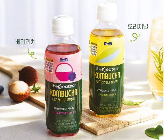 매일유업의 완제품 콤부차인 ‘더그레잇티 콤부차’. 이 제품은 기능성 표시 식품으로, 식물성 프리바이오틱스 구아검 가수분해물과 식이섬유를 4g씩 함유하고 있다. 오리지널과 베리리치의 2종류로 출시됐으며, 300ml 용량의 페트병에 담겨서 제공된다. 당 함량은 100ml당 4g이며, 300ml 한 병의 열량은 90kcal다.