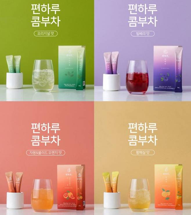 액상형 중에서 추천하고 싶은 제품은 ‘편하루 액상 콤부차’ 시리즈다. 찬물에 잘 녹는 콤부차 농축액을 1회 분량씩 나눠서 담은 액상형 스틱 제품이다. 헛개열매, 감초, 모링가, 프로폴리스, 마누카 꿀, 호박 등을 활용해 제조되며, 설탕과 카페인이 들어 있지 않아 부담 없이 즐길 수 있다. 구수함을 느낄 수 있는 ‘오리지널’, 새콤달콤한 맛의 ‘빌베리’, 새콤함이 강조된 ‘자몽 블러드오렌지’, 신맛이 덜한 ‘황매실’의 네 가지 맛을 선택할 수 있다.
