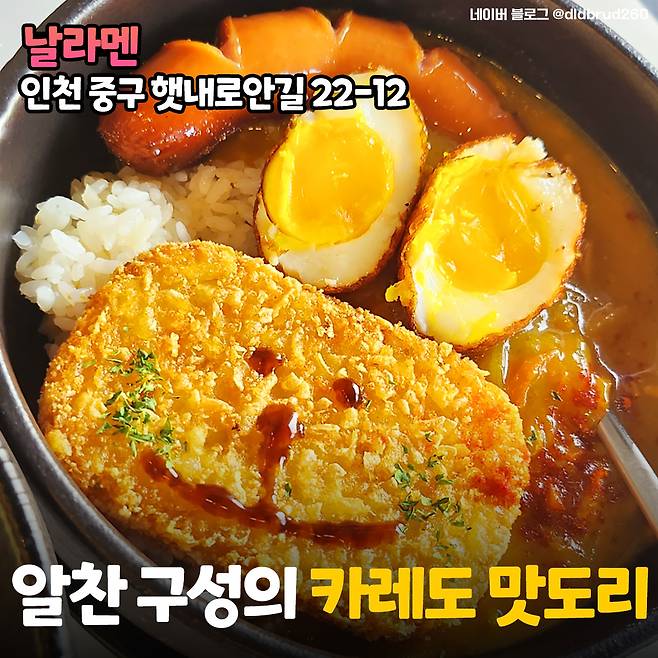 날라멘은 라멘집이지만 카레도 판매한다고 해요. 심지어 비주얼... 너무 귀엽지 않나요ㅋ.ㅋ 밥과 카레에 귀여운 표정의 감자고로케와 짭짤 촉촉한 반숙계란, 육즙 터지는 통소시지 한줄까지 올라가 있어 사진으로만 봐도 푸짐함이 느껴져요.