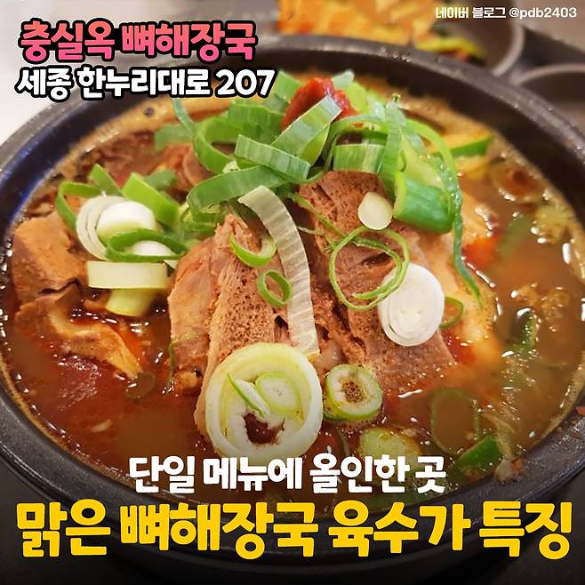 세 번째는 세종시에 위치한 뼈해장국 맛집 <충실옥>이에요! 원래 <고향옥>이라는 이름으로 유명했는데 상호명을 바꾼지 얼마 안된 모양이더라구요. 이곳 메뉴는 뼈해장국 단 하나! 오직 뼈해장국만 하루에 100그릇씩 판매하는 곳이예요.